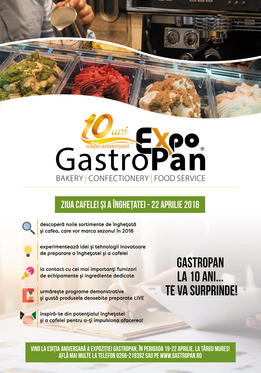 Așadar, ziua de duminică va fi dedicată cafelei și înghețatei, vizitatorii având ocazia de a descoperi noutățile pieței, prin degustări și demonstrații de preparare și servire. Veți putea degusta în premieră sortimentele de înghețată și cafea, care vor marca sezonul în 2018, veți experimenta idei și tehnologii inovatoare din domeniu, veți intra în contact cu cei mai importanți furnizori de echipamente și ingrediente dedicate și vă veți putea inspira din potențialul înghețatei și a cafelei pentru a vă impulsiona afacerea.